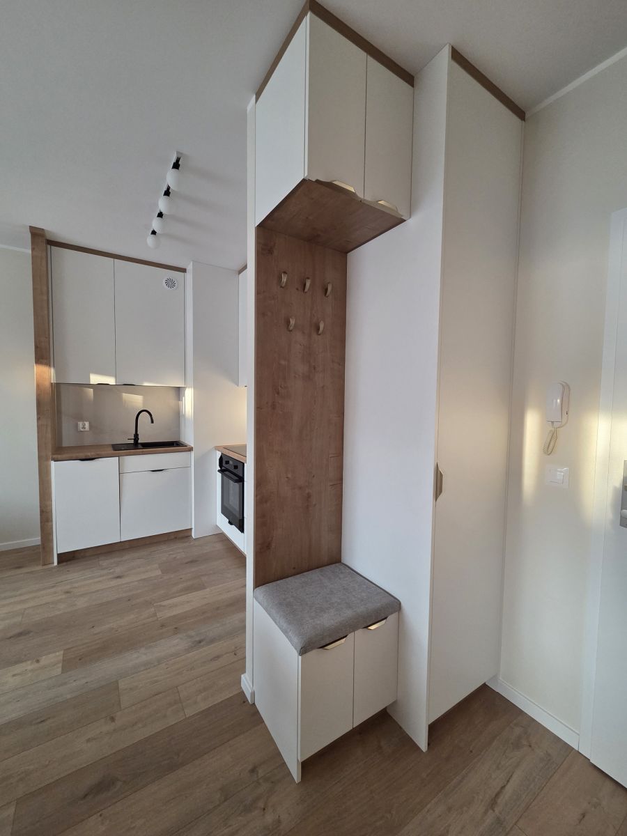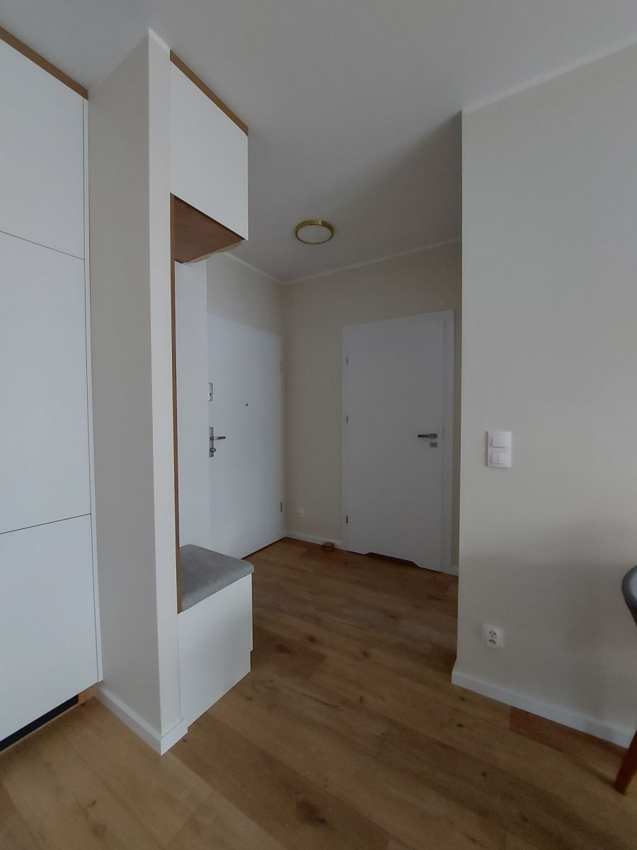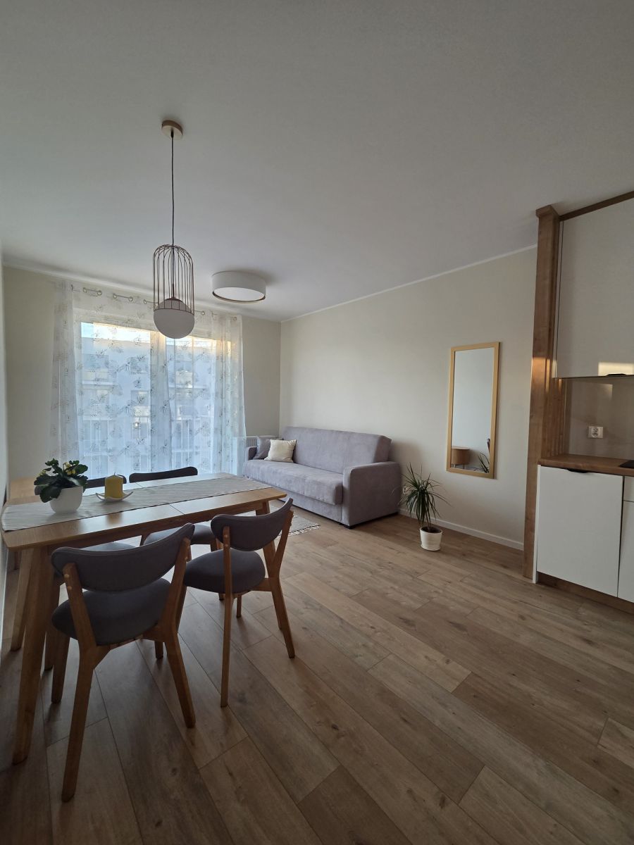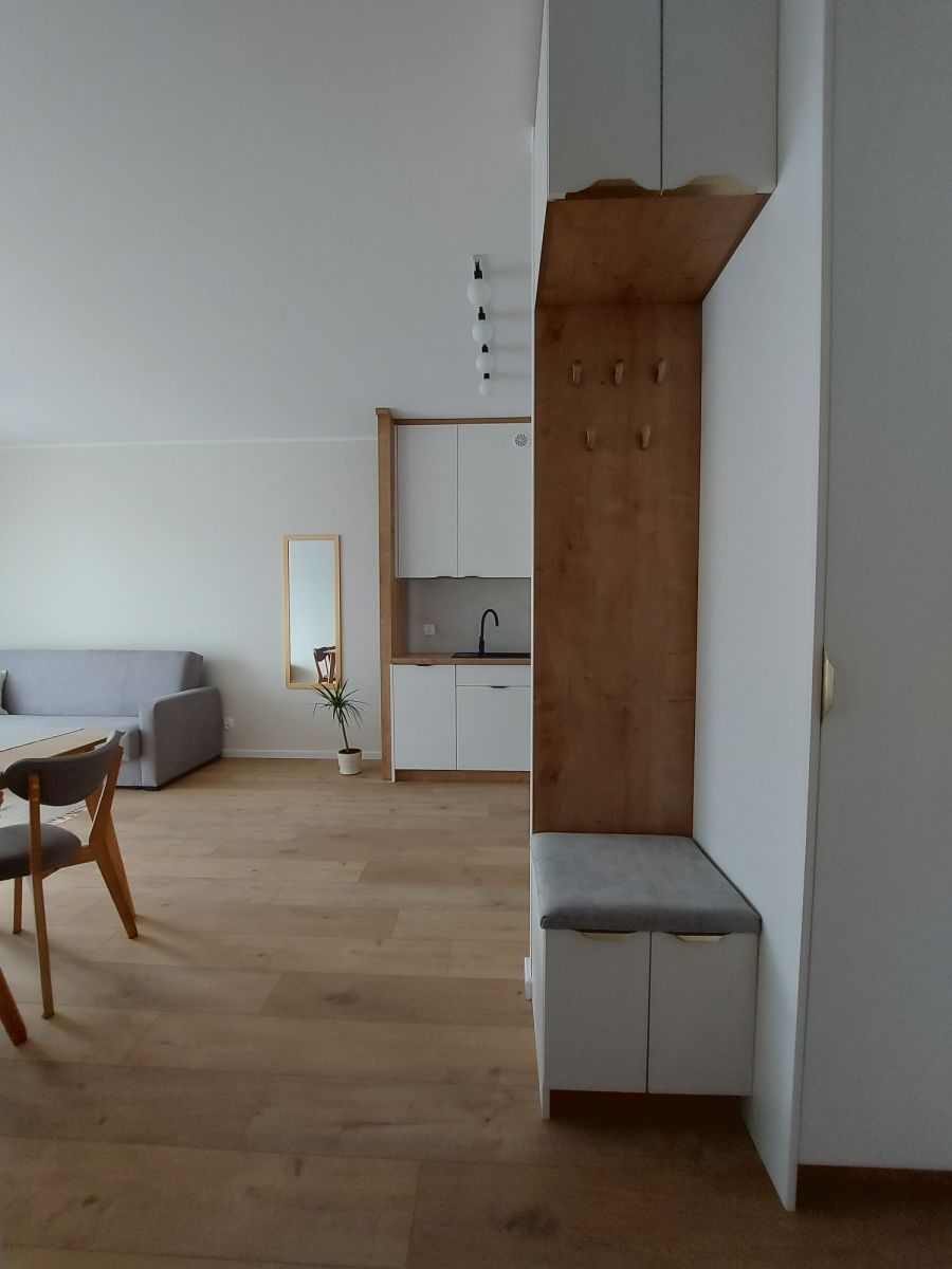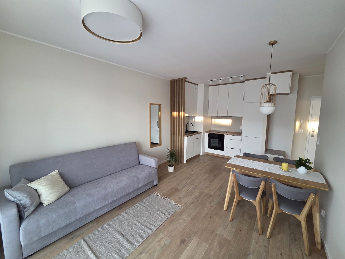 Budynek dewelopera EuroStyl z 2025r., ocieplony i otynkowany z windą. Klatka zadbana. Wewnątrz mieszkania znajduje się jeden pokój z aneksem kuchennym, sypialnia, łazienka z WC, przedpokój. W lokalu na podłodze zastosowano panele, zaś ściany zostały pomalowane w jasnym kolorze. Łazienka w gustownej glazurze i terakocie z kabiną prysznicową i pralką. Kuchnia jasna w modnej zabudowie wraz ze sprzętem AGD - nowy na gwarancji ( lodówka, zmywarka, płyta indukcyjna, piekarnik, okap ). W lokalu mieszkalnym pozostaje umeblowanie widoczne na zdjęciach. Lokal usytuowany jest na trzecim piętrze z możliwością wyjścia na balkon.